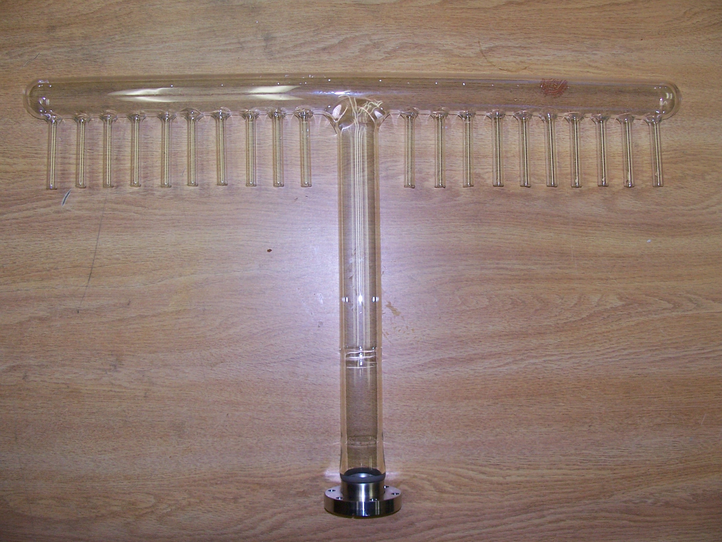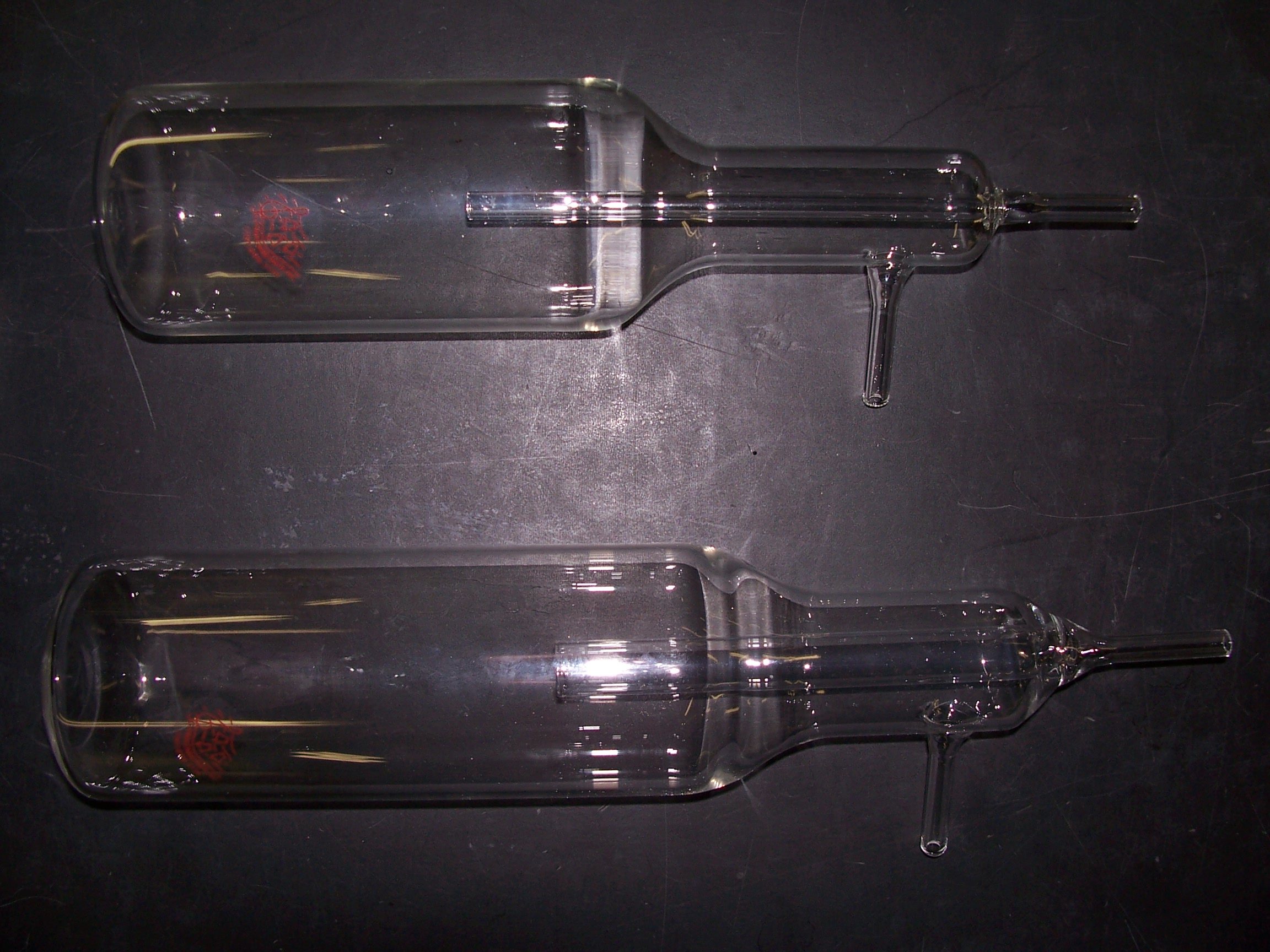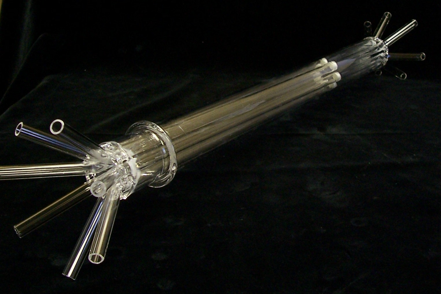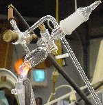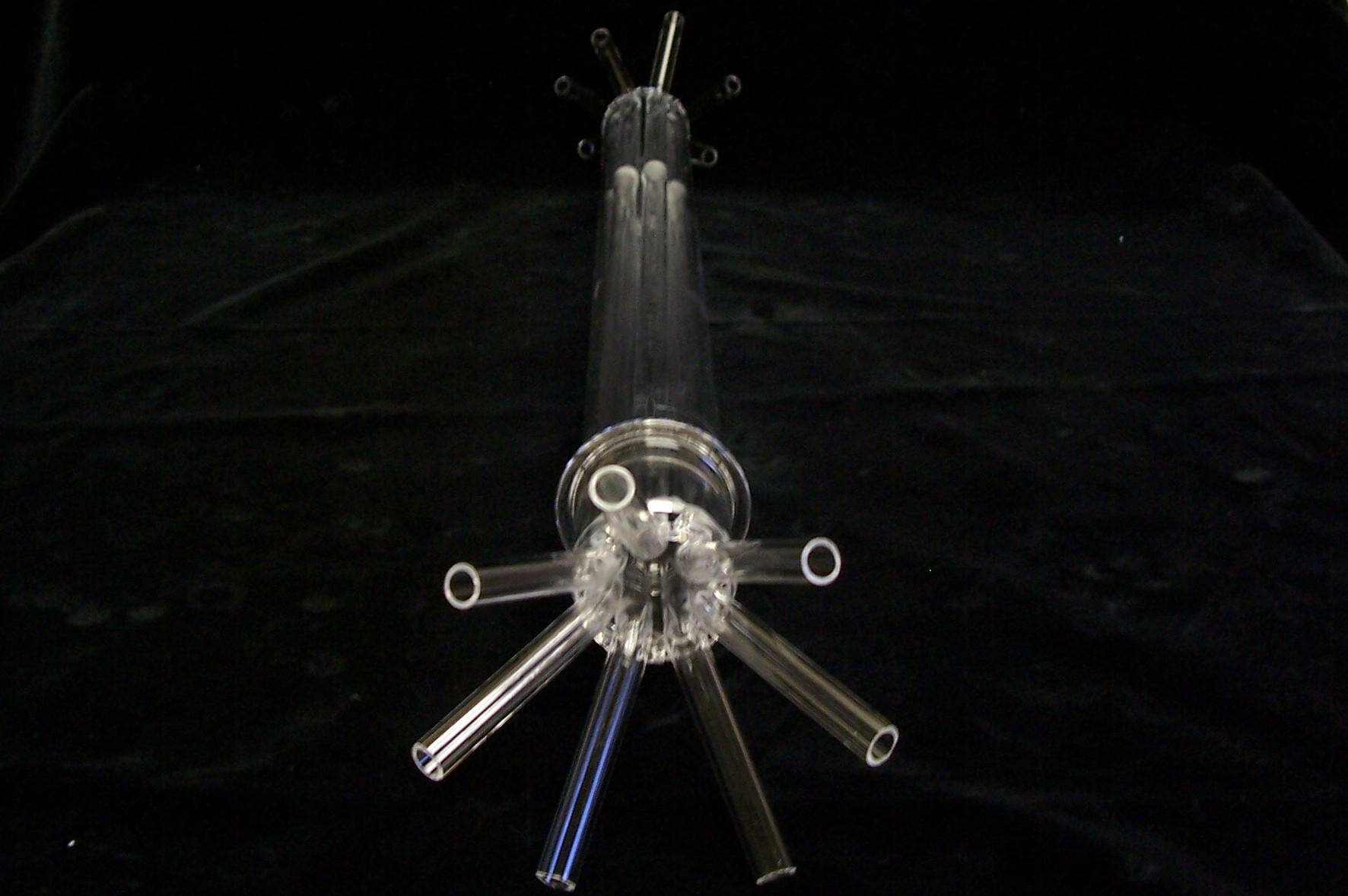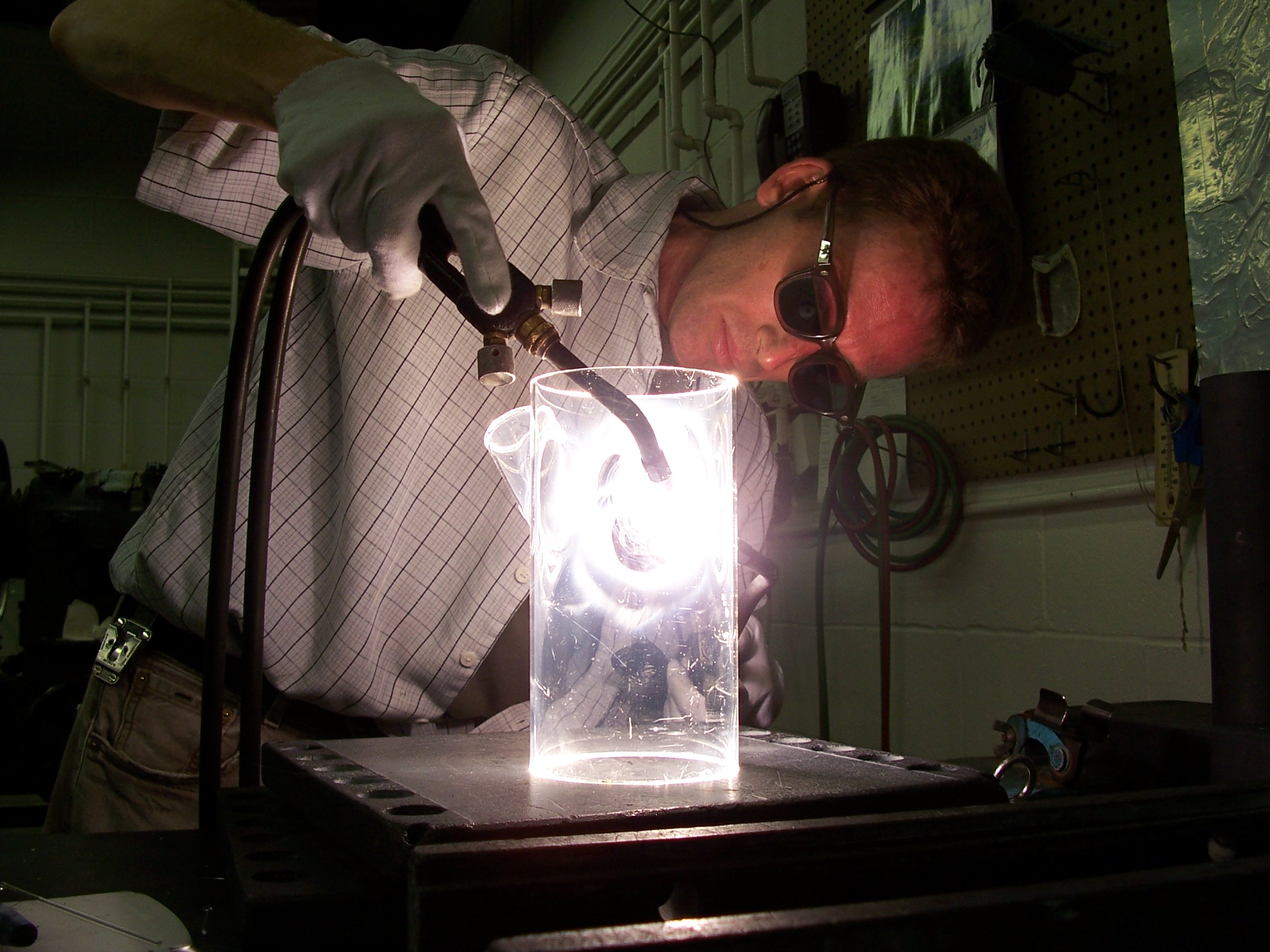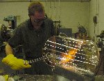 Thomas Hession is necking down a large diameter quartz tube in this clip. Protective clothing and a face shield must be worn to provide shielding from the immense amount of heat given off by the hydrogen burners. It takes a tremendous amount of energy to work the material.