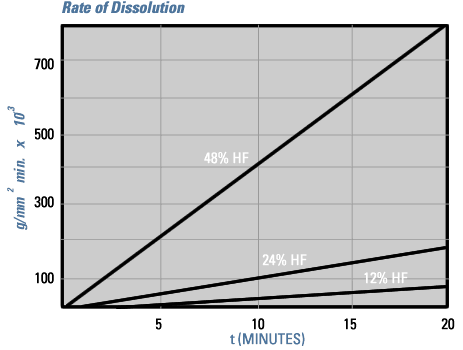 For applications in which cleanliness is important, General Electric recommends the following procedure: The product, particularly tubing, should be washed in deionized or distilled water with a degreasing agent added to the water. The fused quartz should then be placed in a 7% (maximum) solution of ammonium bifluoride for no more than ten minutes, or a 10 vol % (maximum) solution of hydrofluoric acid for no more than five minutes. Etching of the surface will remove a small amount of fused quartz material as well as any surface contaminants. To avoid water spotting which may attract dirt and cause devitrification upon subsequent heating, the fused quartz should be rinsed several times in de-ionized or distilled water and dried rapidly. To further reduce the possibility of contamination, care should be used in handling fused quartz. The use of clean cotton gloves at all times is essential. Washing of translucent tubing is not recommended because the water or acid solution tends to enter the many capillaries in the material. This may cause the quartz to burst if the pieces are subsequently heated rapidly to very high temperatures.